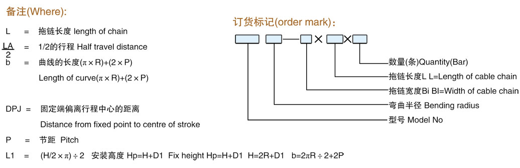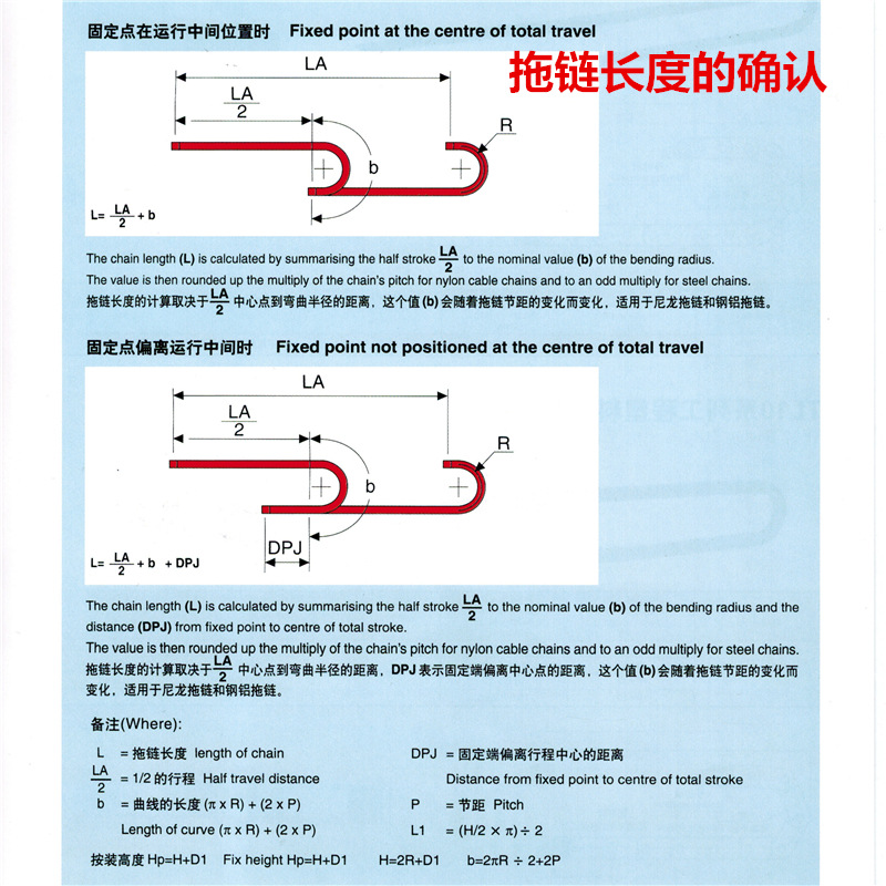 拖鏈長度的計算取決于LA/2中心點到彎曲半徑的距離,這個值(b)會隨著拖鏈節(jié)距的變化而變化,適用于尼龍拖鏈和鋼鋁拖鏈。