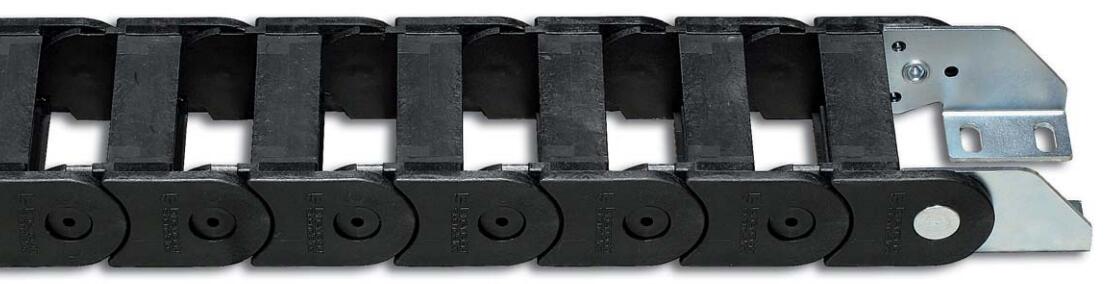 尼龍拖鏈端部連接頭端部連接頭裝置允許拖鏈的兩端都與設備相連。 端部連接頭的電纜夾和行程中點的限位器可以根據(jù)需要提供。