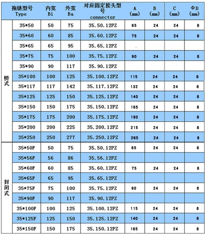 25系列工程塑料拖鏈規(guī)格:
